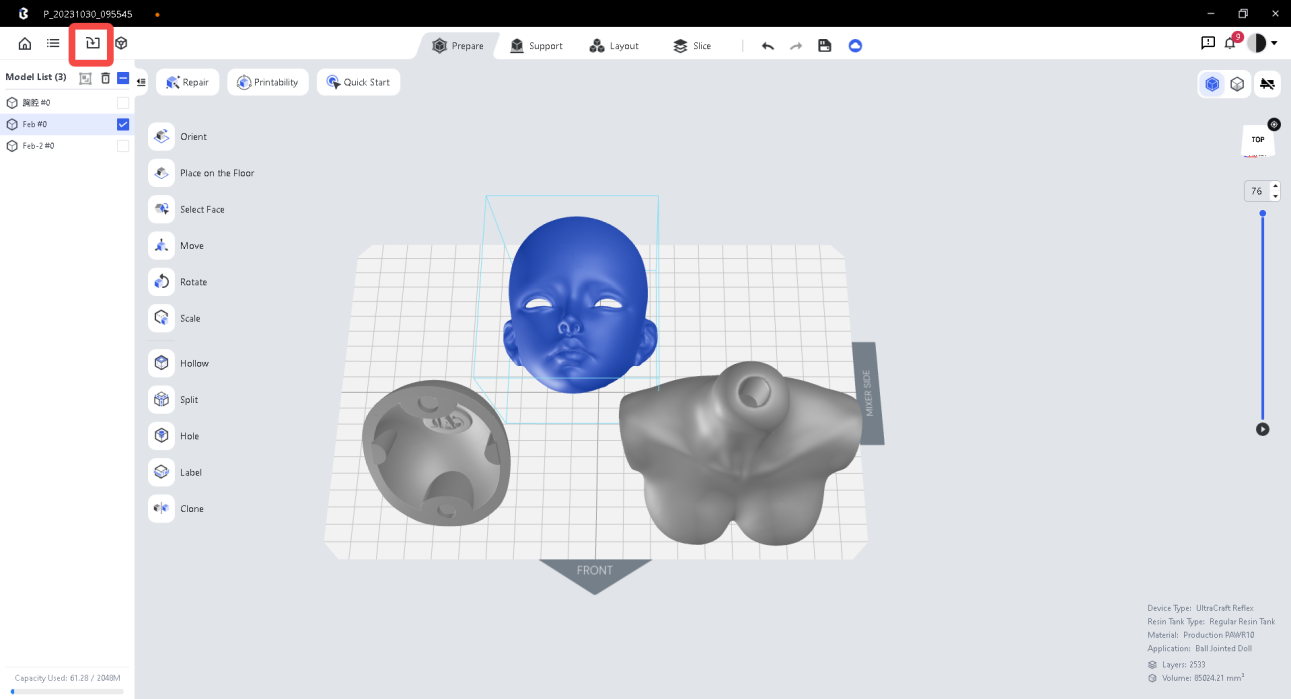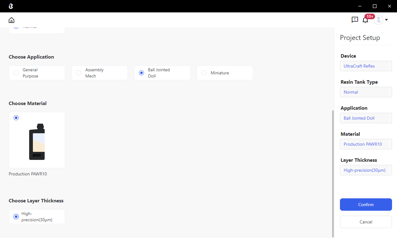 2.Create a new project and set the parameters as: UltraCraft Reflex, Regular Resin Tank, Ball-Jointed Doll, Production PAWR10, High-precision (30 μm).